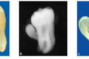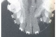 ) Röntgenülesvõte. Ülemise esimese jäävmolaari lõikumine on takistatud 2. piimamolaari tõttu